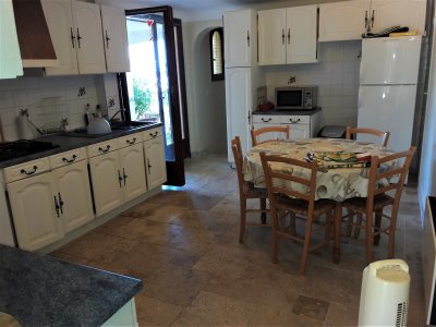 Die große Küche ist voll ausgestattet mit Gasherd, Elektro-Backofen, Dunstabzugshaube, Spülmaschine, Mikrowelle, einem großen Kühlschrank mit Gefrierschrank, Kaffeemaschine und Geschirr für 10 Personen. Der Küchentisch eignet sich für kleinere Mahlzeiten oder als Arbeitsbereich beim Kochen. Direkt von der Küche gelangt man zu einem überdachten Essplatz zum Essen im Freien oder einem Frühstück in der Morgensonne.