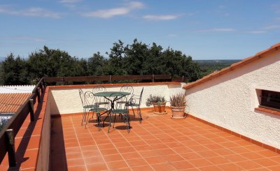 Eine Besonderheit des Hauses sind die vier Balkone und Terrassen in alle vier Himmelsrichtungen: Von der großen Sundowner-Terrasse im ersten Obergeschoß erstreckt sich ein herrlicher Ausblick über in die Berge, zur Dorfkirche und über das weite Land bis zum Meer bei Argelès-sur-Mer. Die Terrasse ist nach Südwesten ausgerichtet und eignet sich ideal für Drinks und Abendessen bei Sonnenuntergang. Die große Südterrasse liegt im Garten zwischen Pool und Grill. Die beiden kleineren Balkone sind vor der Küche und der Galerie.